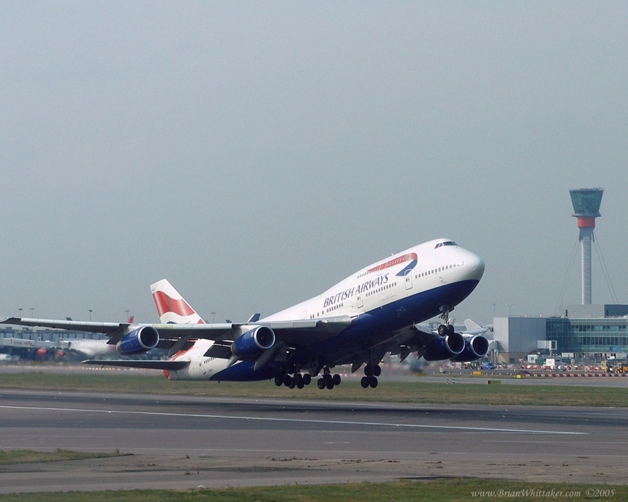 | British Airways Boeing B747-400 taking off from London's Heathrow Airport. Visible to the right is the new Control Tower, just east of the new Terminal 5. | Boeing 747-400 taking off at London's Heathrow Airport. Overlooking British Airway's two Boeing B777, a Boeing B767, and an Airbus A320, is visible the old Control Tower in the central area. Photo enhanced to give a surreal effect. |